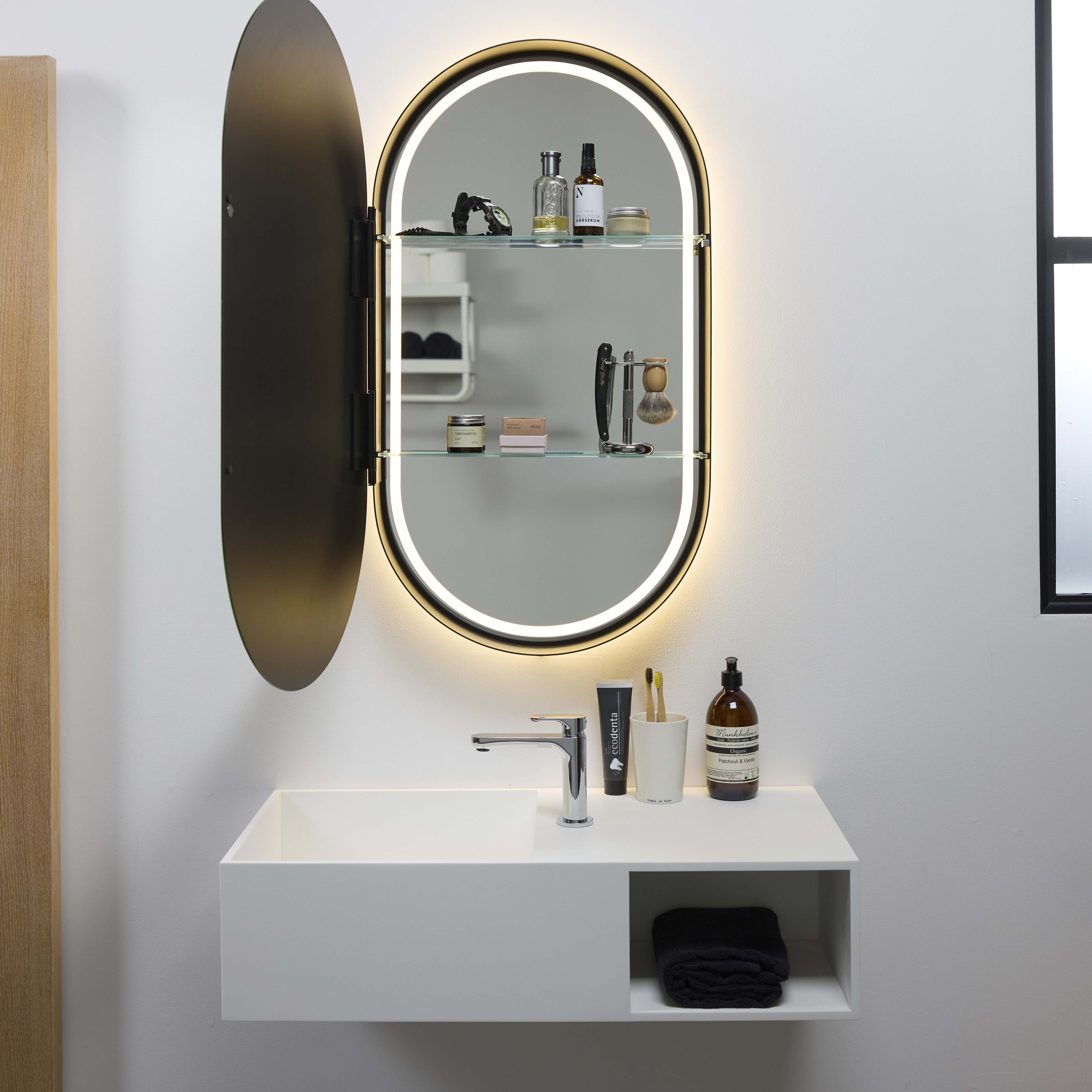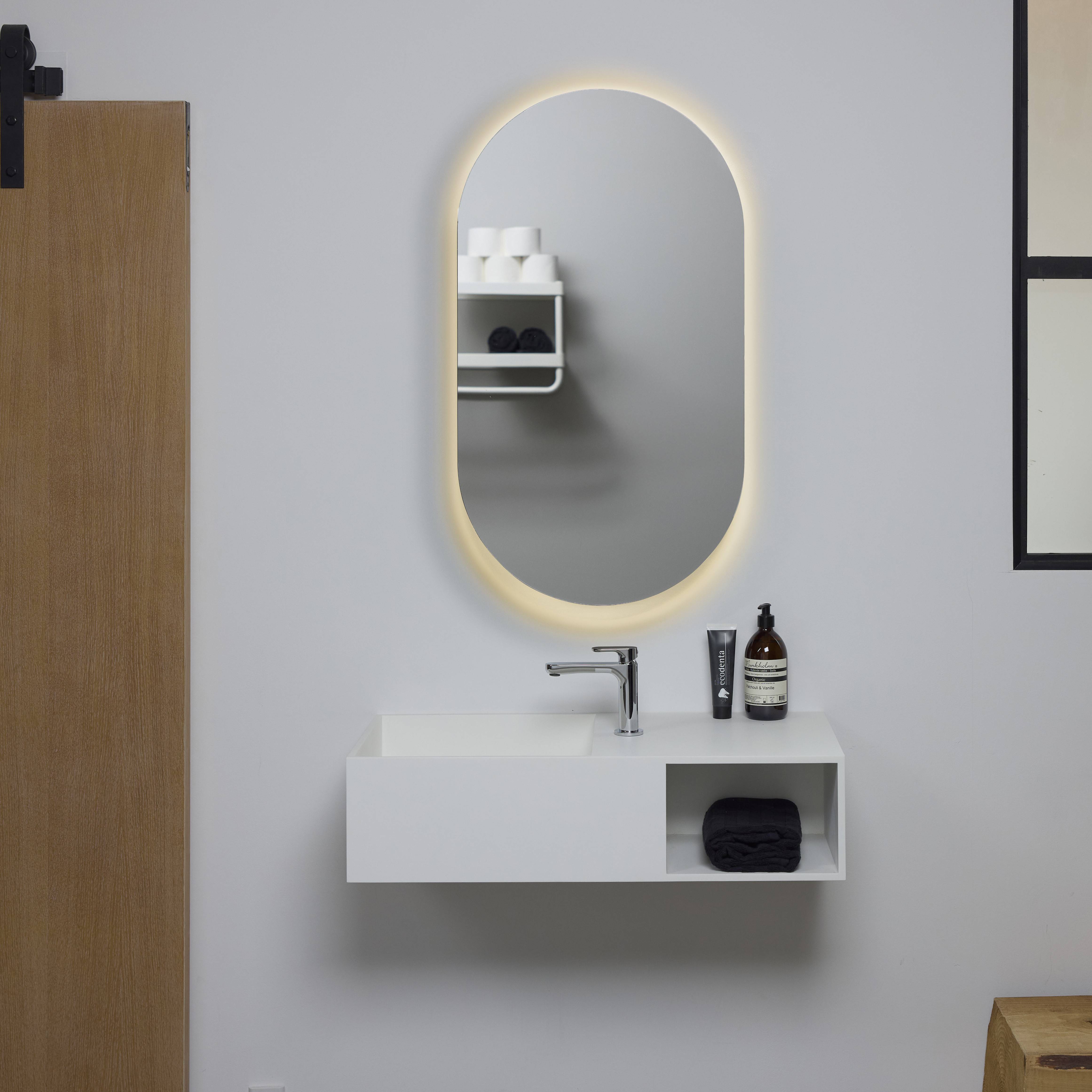 Den ovale formen gir speilskapet et mykt og enkelt uttrykk som passer inn i både små og store bad. Det integrerte lyset ligger jevnt langs kanten og gir speilet en svevende effekt på veggen.