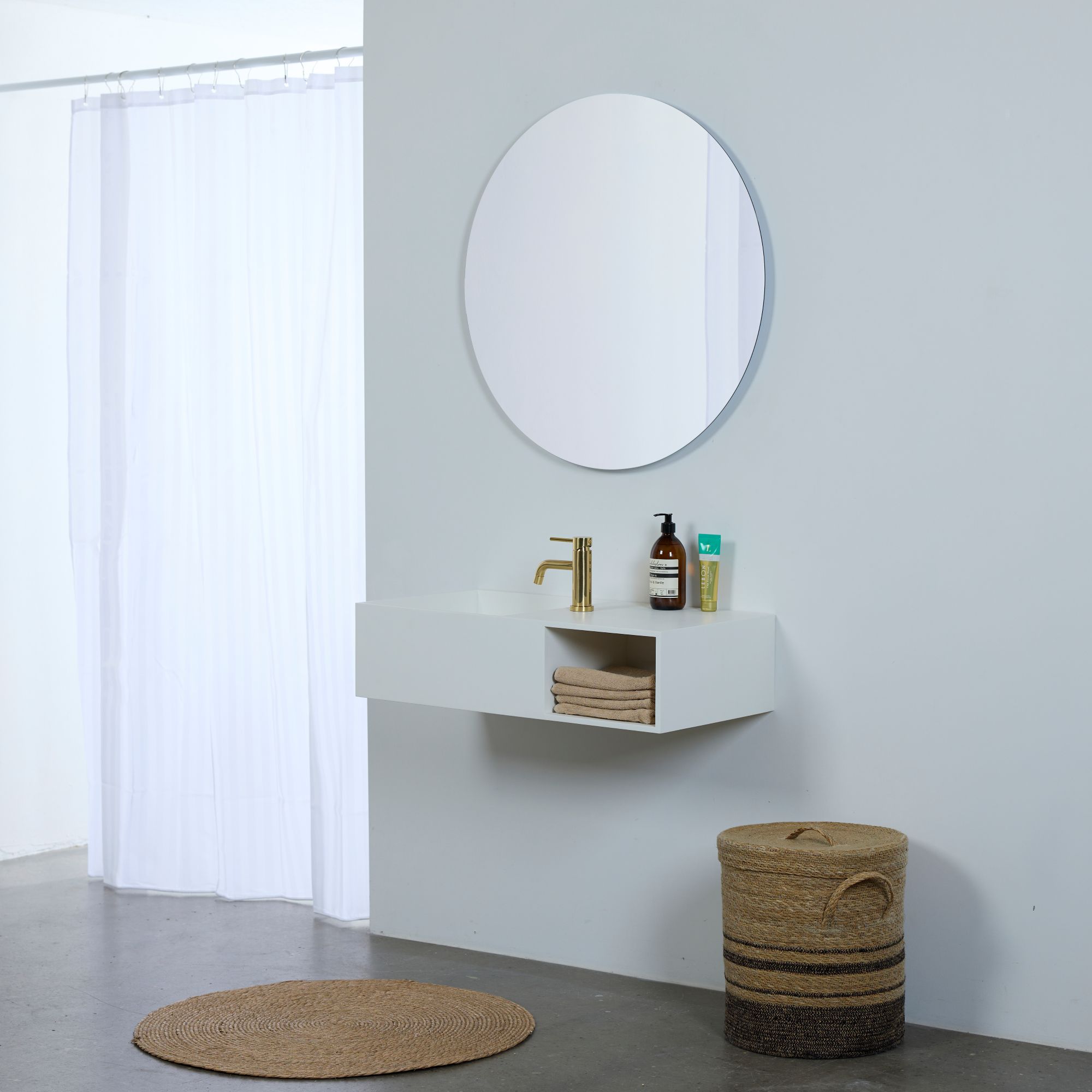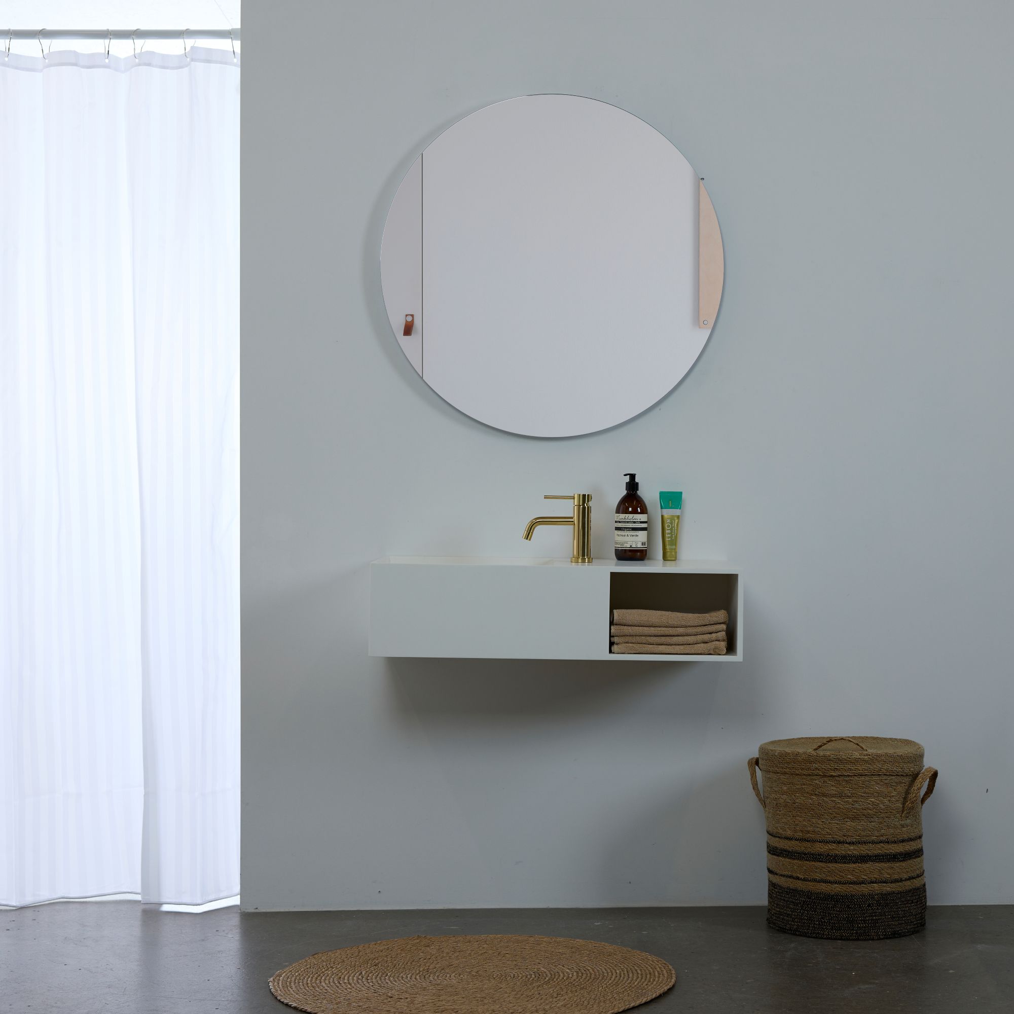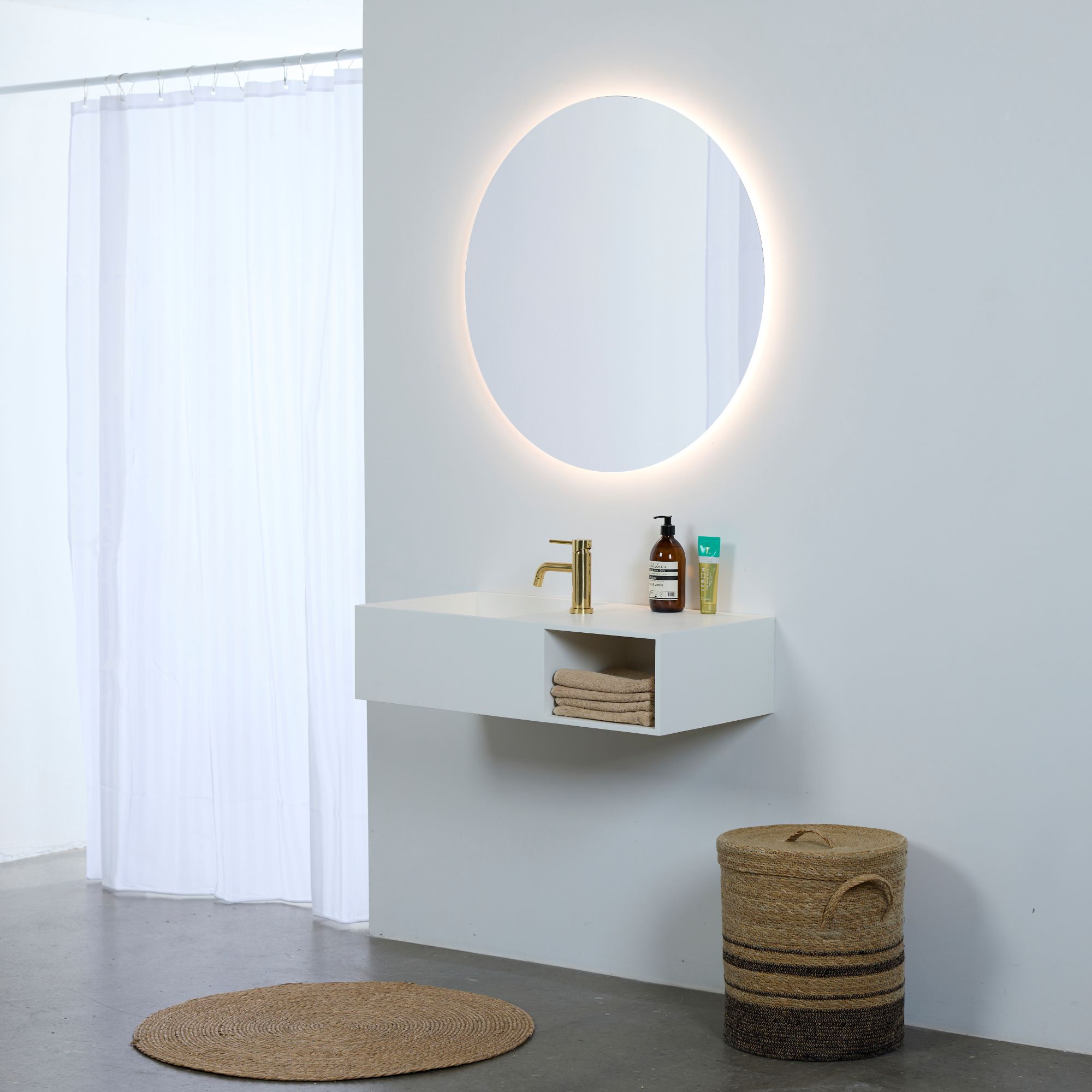 Flytende rundt speil med bakgrunnsbelysning som gir en vakker lyseffekt på veggen. Speilet har skjulte LED-dioder som sender lyset mykt inn på veggen.